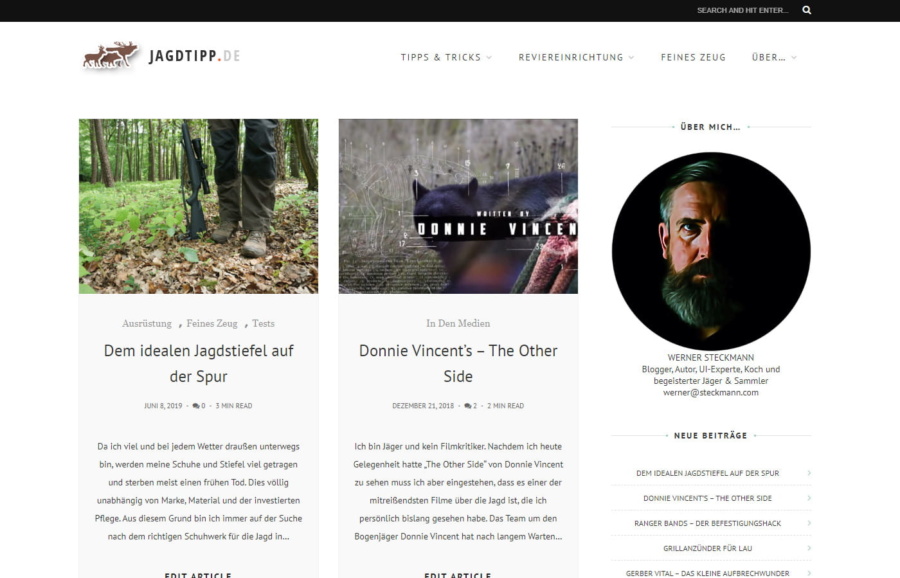 Seit 2012 dreht sich auf meinem Blog jagdtipp.de alles um die kleinen Tipps und Tricks, die einem draußen im Revier das Leben erleichtern. Ergänzt werden diese von Rezensionen, Bauanleitungen, Produkttests und -empfehlungen. Aus dieser Arbeit ergeben sich interessante Synergyeffekte und Kontakte, die meiner Arbeit neue Impulse geben. Dies ermöglicht den Blick über den eigenen, jagdlichen Tellerrand und erweitert den jagdlichen Horizont.